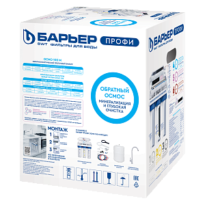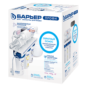 Шестиступенчатый фильтр обратного осмоса в классическом корпусе с картриджами стандарта Slim Line 10. Не только очищает воду, но и насыщает её полезными ионами кальция, фтора и магния до физиологической нормы. Вода проходит несколько этапов очистки, включая обратноосмотическую мембрану. Тонкопленочный полиамидный композит, из которого изготовлена мембрана, очищает воду на молекулярном уровне до 100%, задерживая всевозможные примеси, включая бактерии и вирусы. Вода после фильтра обратного осмоса БАРЬЕР не уступает по качеству бутилированной. Показатели после фильтрации: общая минерализация — более 80 ppm, pH в диапазоне 6-9. Показатель минерализации может варьироваться в зависимости от условий эксплуатации и водопотребления.