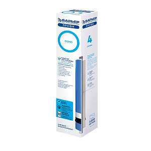 БАРЬЕР ПРОФИ Осмо 100 - это четвертая ступень и основной элемент обратноосмотического фильтра. Материал картриджа — мембранное полотно, изготовленное из композитного материала с порами размером в 10 миллионов раз меньше миллиметра. Тонкие поры мембраны пропускают молекулы воды и задерживают соли жесткости, нитраты, железо, а также вирусы и бактерии. Чистая вода поступает на следующий этап фильтрации, а вредные примеси смываются в дренаж.