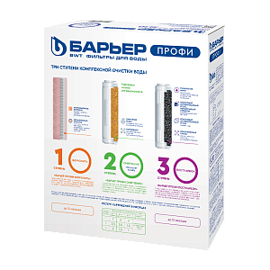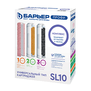 Сменные картриджи для проточного фильтра БАРЬЕР стандарта Slim Line 10 (SL10) подходят к любой проточной системе БАРЬЕР ПРОФИ. Комплект сменных картриджей БАРЬЕР ПРОФИ Комплекс для жесткой воды с высоким содержанием железа. Позволит забыть о накипи, неприятном металлическом привкусе воды и желтоватом осадке в чайнике. Производительность — 2 л/мин, ресурс — 10 000 литров.