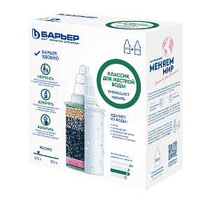 Комплект из 2 сменных кассет для фильтра БАРЬЕР Классик для жесткой воды. Экономичная очистка водопроводной воды и легкое умягчение. Кассета БАРЬЕР Классик для жесткой воды снижает образование накипи, а также справляется с хлором, тяжелыми металлами, посторонними привкусами и запахами.