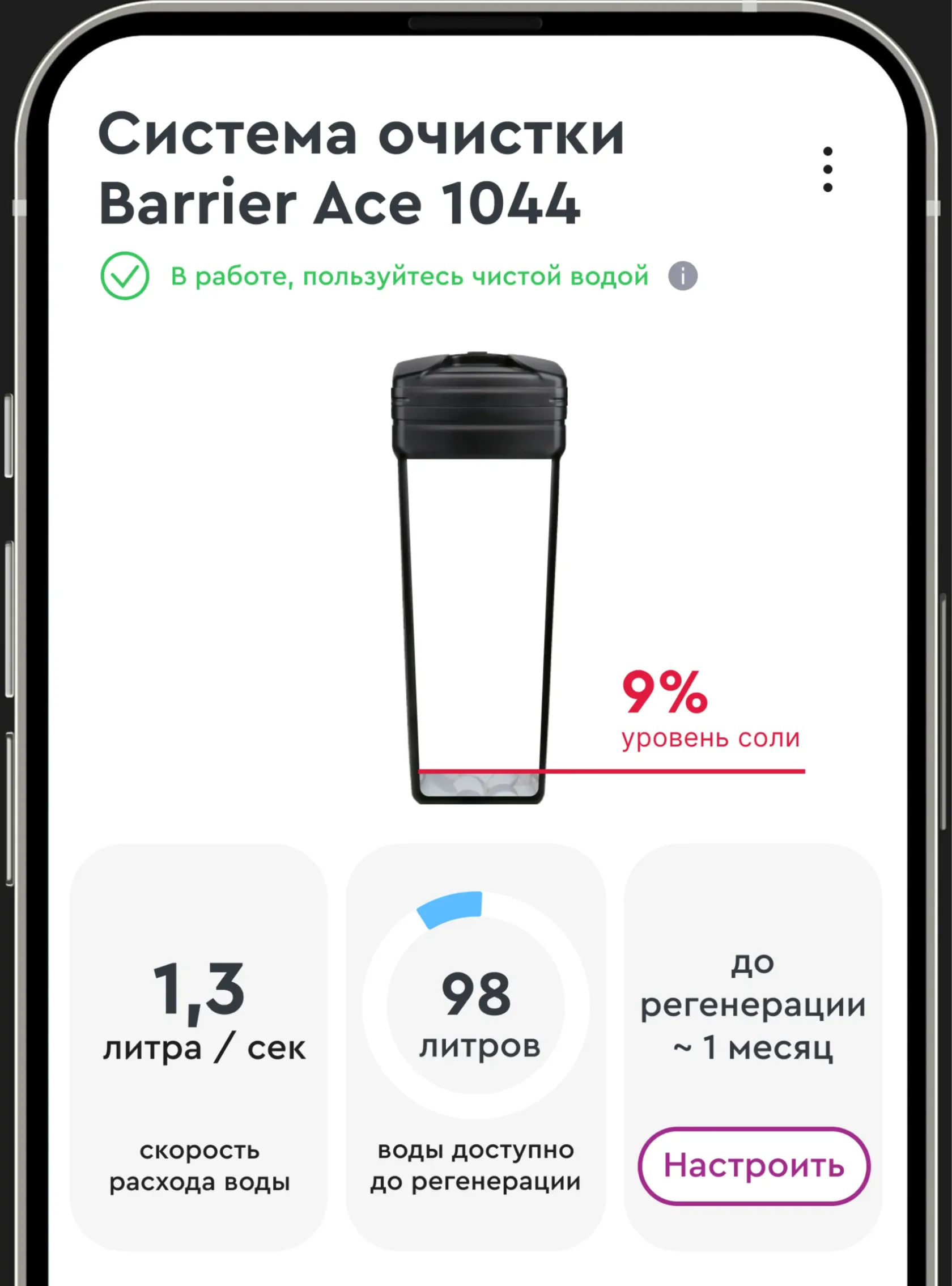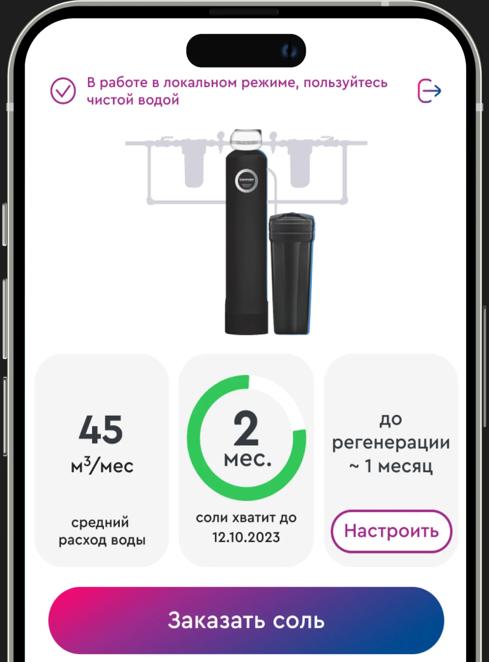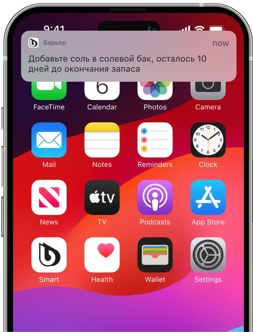 Приложение своевременно напомнит о низком уровне соли в солевом баке, а процесс покупки займет всего два клика.