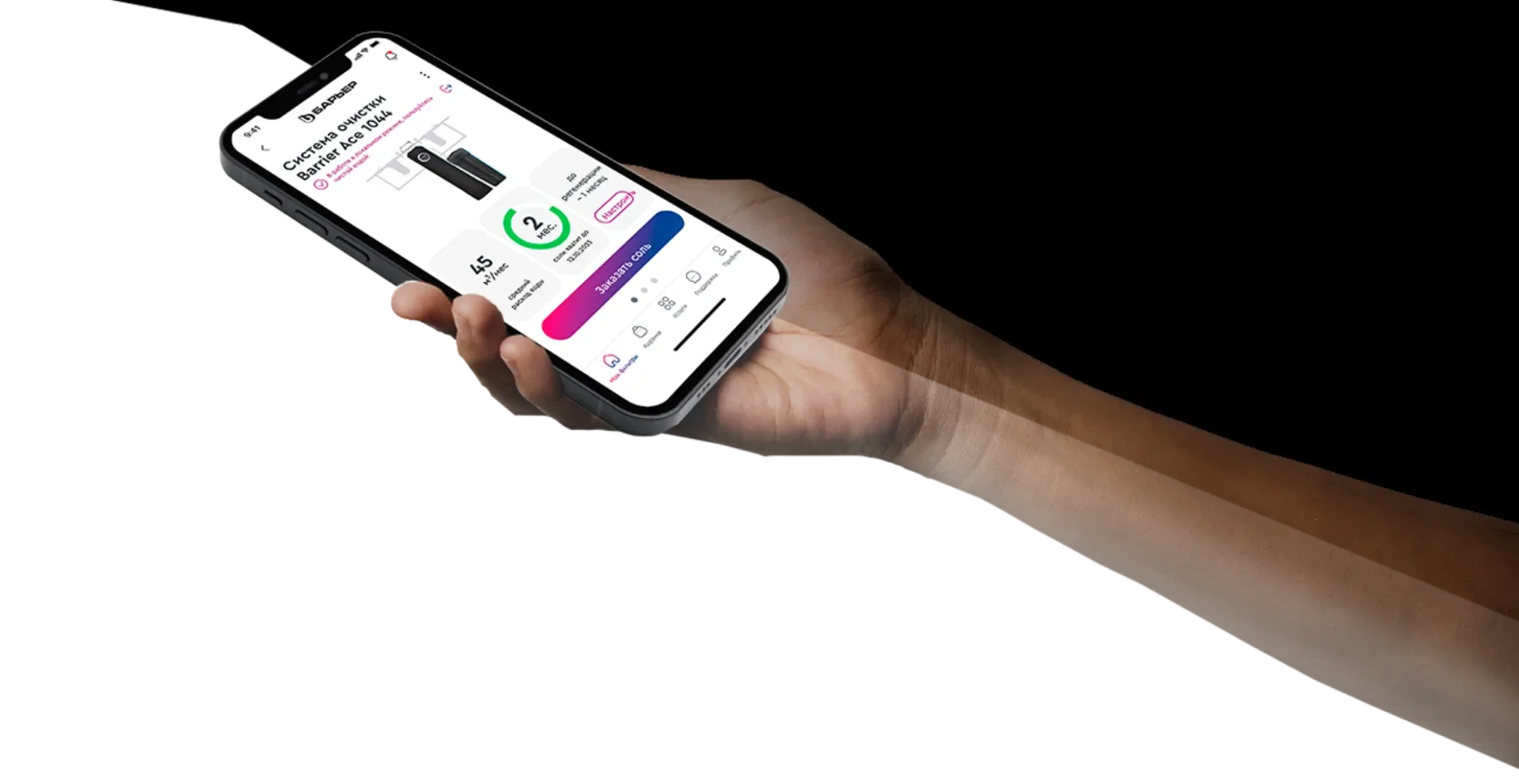 Приложение своевременно напомнит о низком уровне соли в солевом баке, а процесс покупки займет всего два клика.